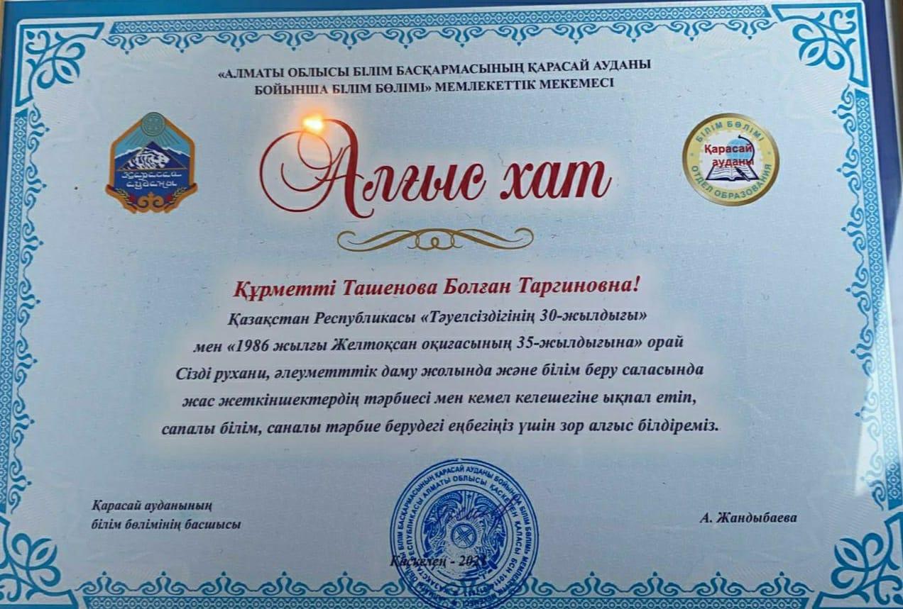 Ташенова Болған Тарғиновна! Алғыс хат! » "Қырғауылды ауылындағы қазақ орта мектебі"